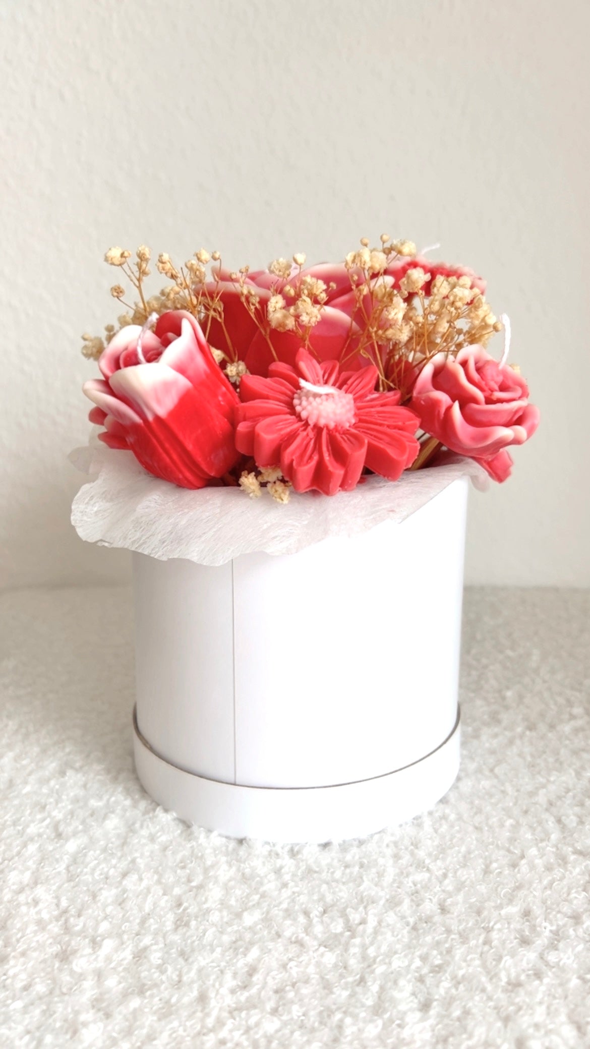 Dieser zauberhafte Kerzenstrauß bringt Wärme und Liebe in jedes Zuhause. Jede Blüte wurde einzeln von Hand gegossen und liebevoll arrangiert.
